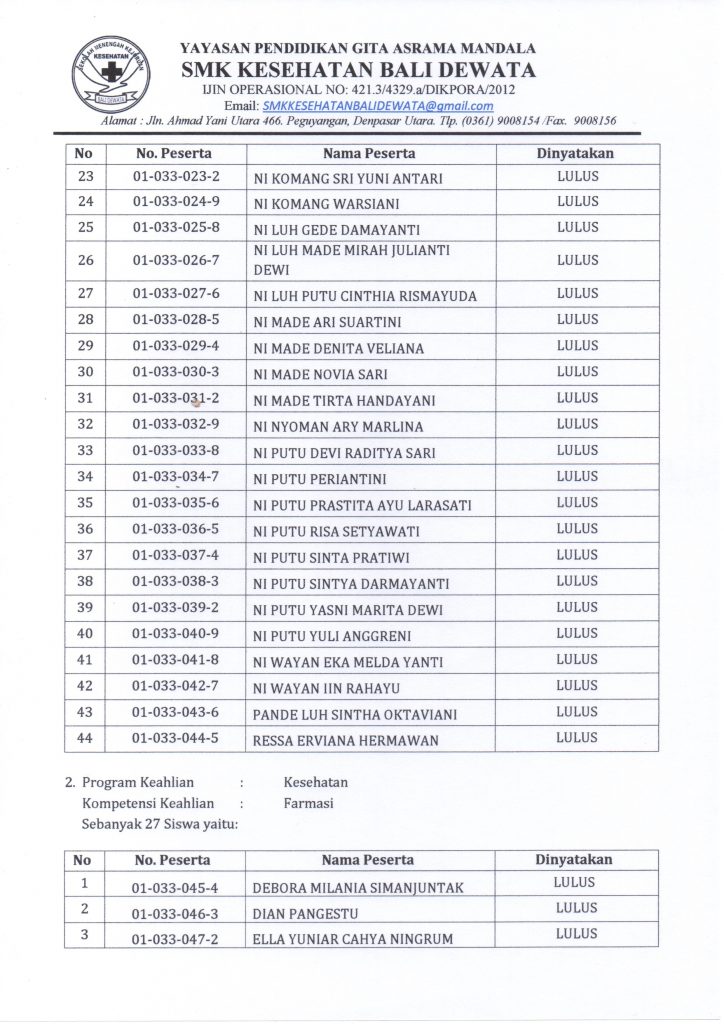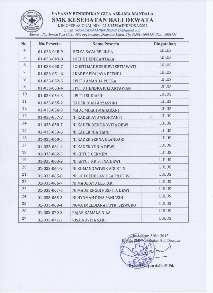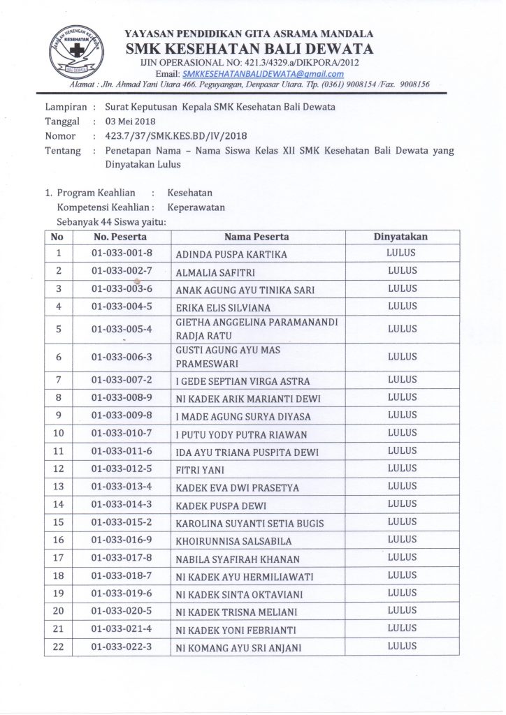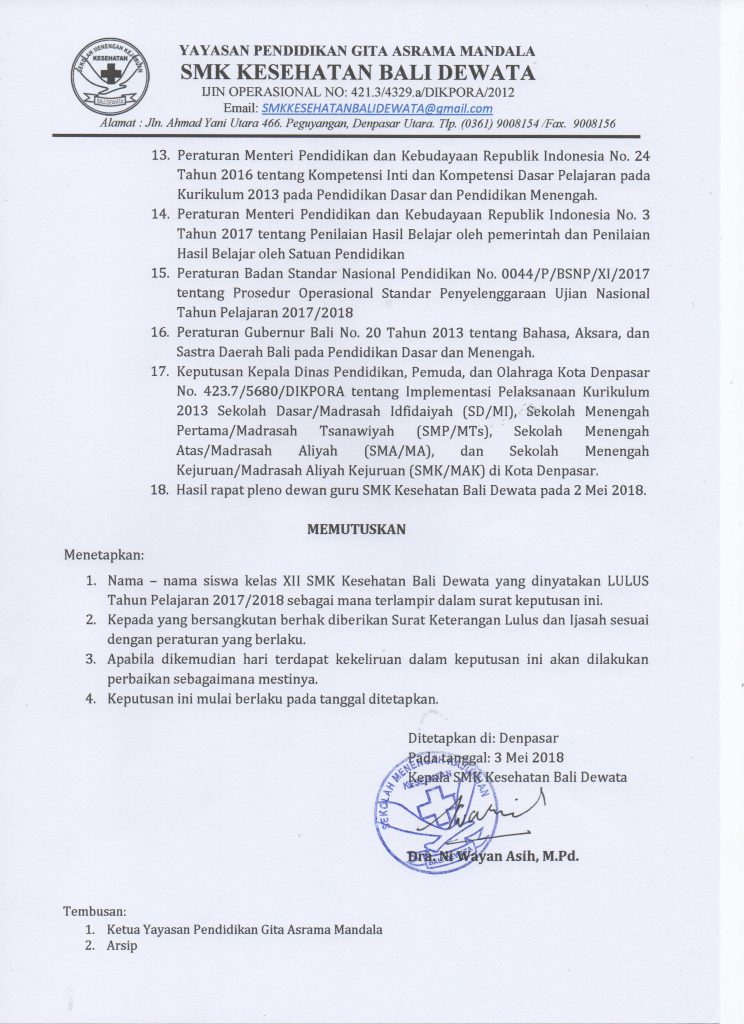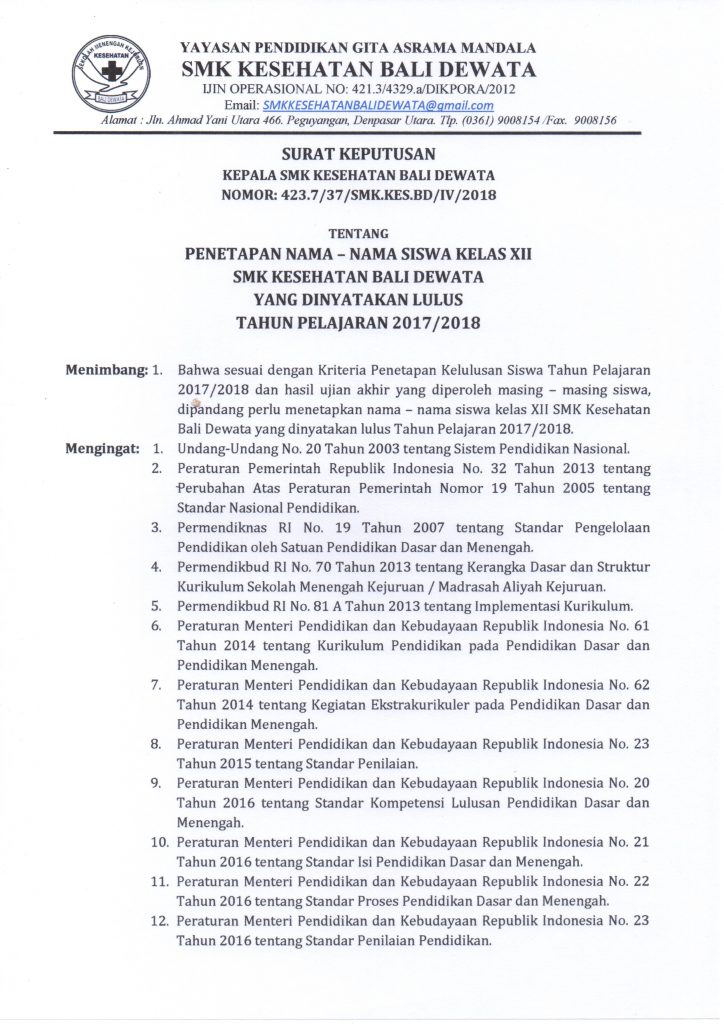 Sehubungan dengan telah berakhirnya kegiatan pembelajaran kelas XII tahun pelajaran 2017/2018 dan dengan telah ditetapkannya Kriteria Penetapan Kelulusan Siswa Tahun Pelajaran 2017/2018 serta hasil nilai ujian akhir yang diperoleh masing-masing siswa, dipandang perlu menetapkan nama-nama siswa kelas XII SMK Kesehatan Bali Dewata yang dinyatakan lulus Tahun Pelajaran 2017/2018.